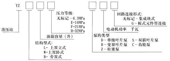 | 标记示例:泵装置上置立式,油箱容量160升,采用单级叶片泵,电机功率2.2千瓦,工作压力6.3MPa集成块式的液压站。可标为:YZL160-D2.2